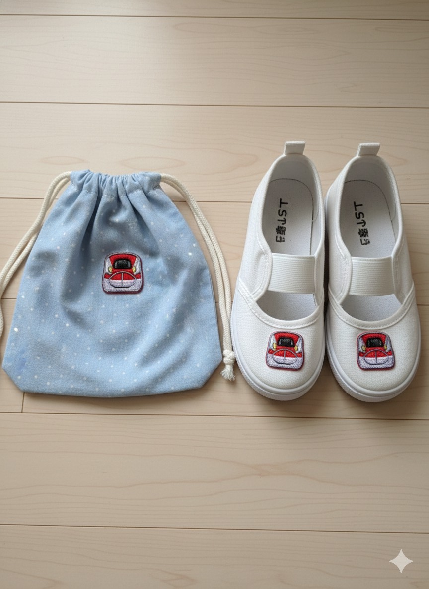 上履きのつま先にペタッと貼るだけで、まだ左右の区別が難しいお子様でも、新幹線の向きを合わせることで楽しく正しく靴が履けます。