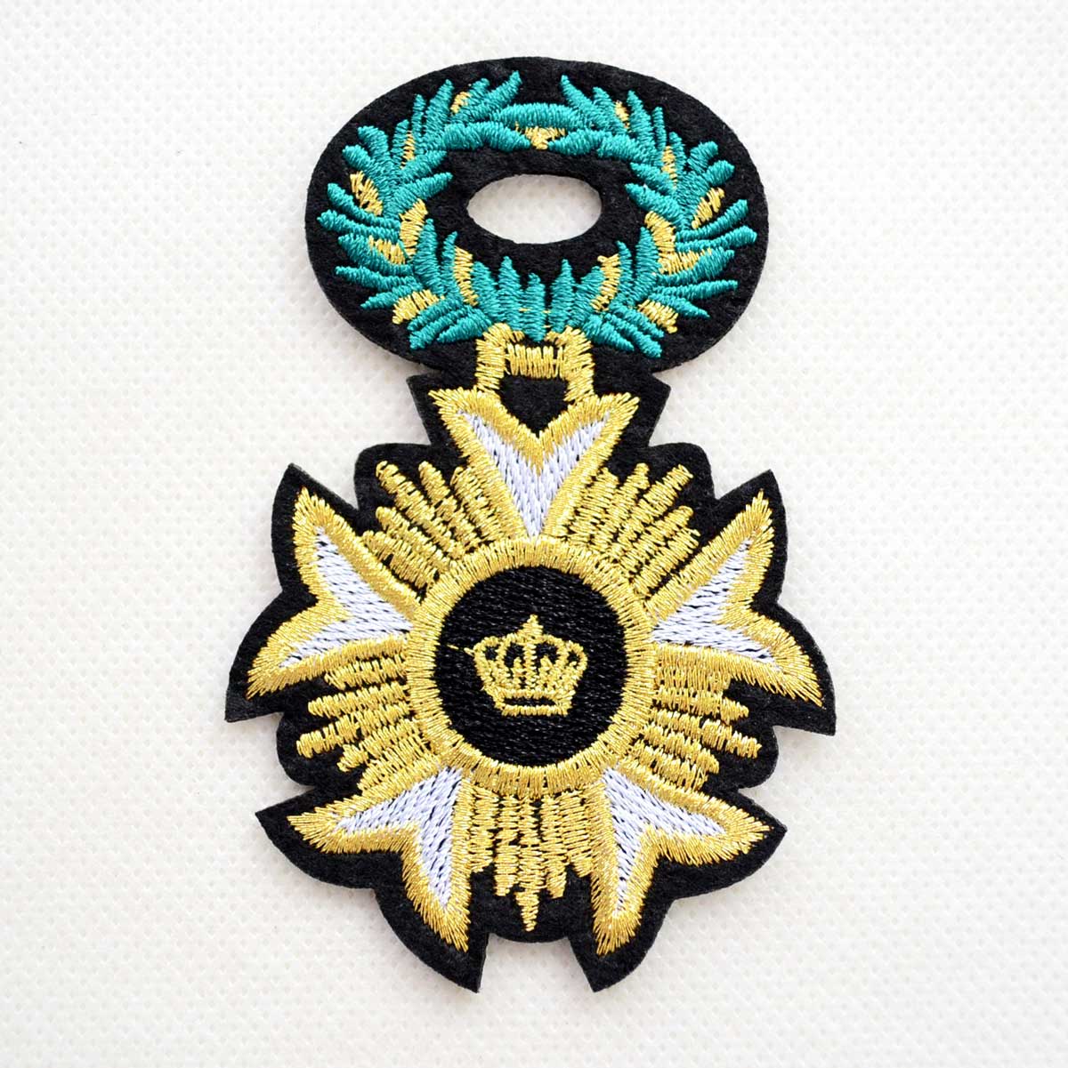 王冠と勲章をモチーフにした高級感ある刺繍ワッペンです。