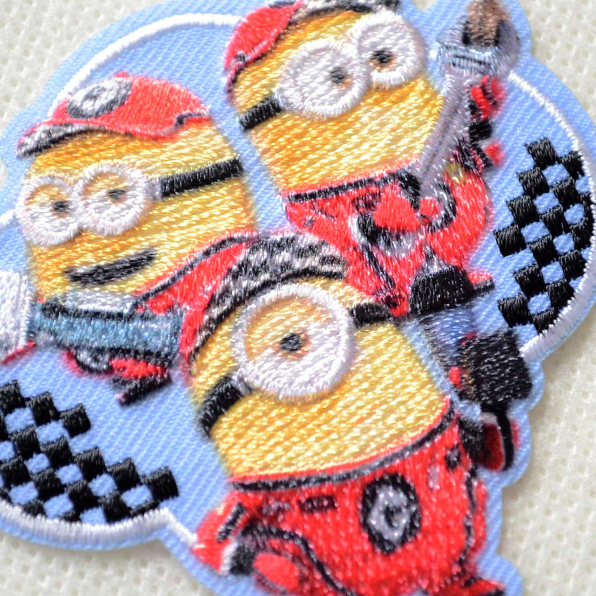 レーシング姿のミニオンたちがデザインされた、かわいくて存在感のあるワッペンです。