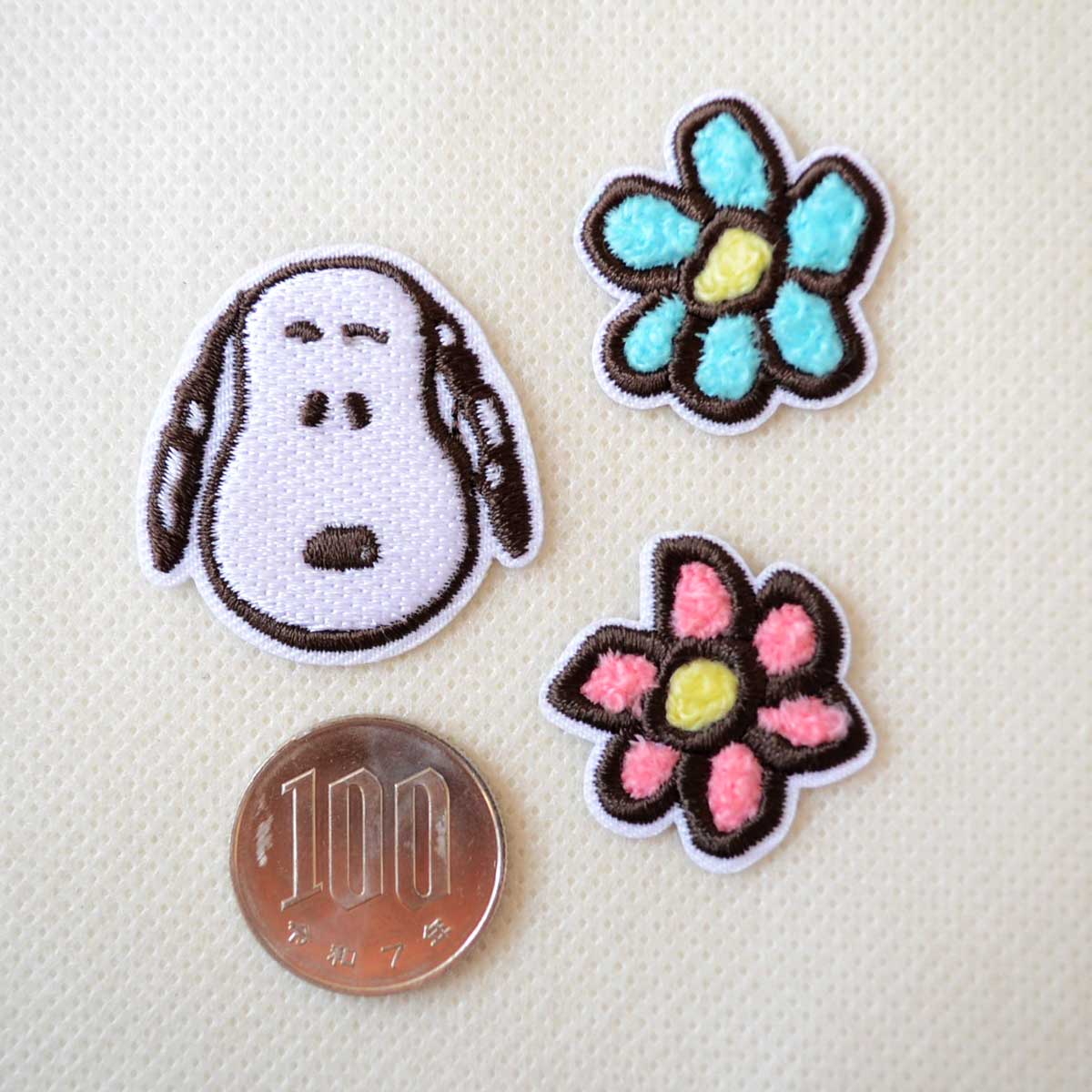 スヌーピーのフェイスワッペンと、水色・ピンクの2色のお花がセットになった豪華な3枚組です。